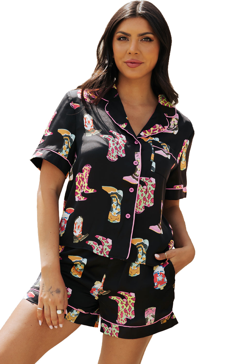 Black Western Boots Printed Short Pajama Set